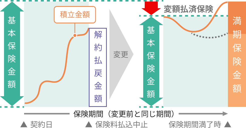 - *解約払戻金額等により、変更後の保険期間満了日が変更前の保険期間満了日よりも短くなることがあります。また、計算の結果、変更後の保険期間が変更前の保険期間を超えるときは、変更前の保険期間満了日までとし、保険期間満了日に被保険者が生存しているときは生存保険金をお支払いします。