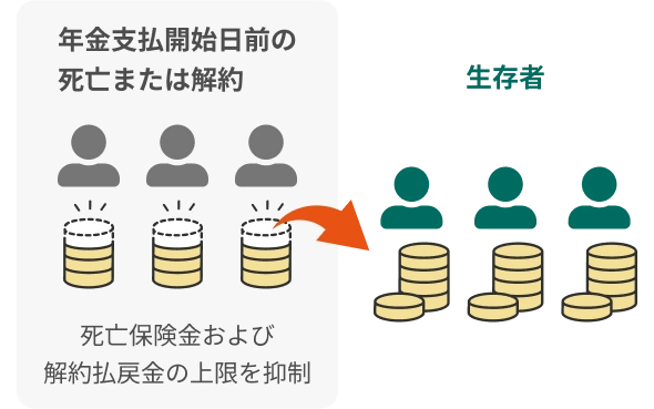 トンチン性とは、年金支払開始日前の死亡保障および解約払戻金を低く抑え、年金原資を大きくするしくみです。